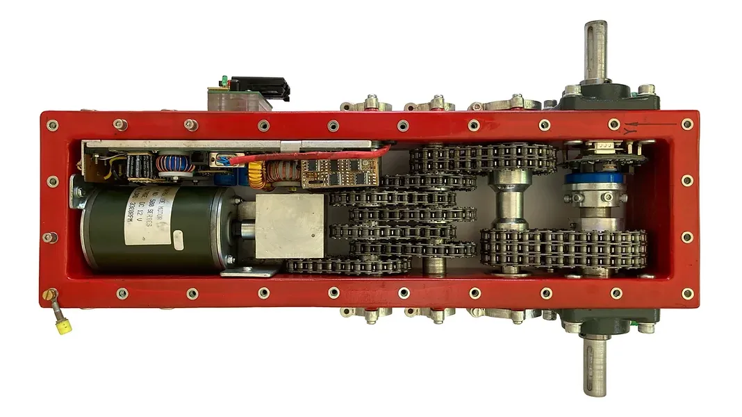 To save volume and weight, our first functional robotic arm, ADM1 was powered by a VW wiper motors in conjunction with an inexpensive tension based chain and sprocket drivetrain. Such a drivetrain is different from those found in typical industrial robots and it turned out to be greatly advantageous.